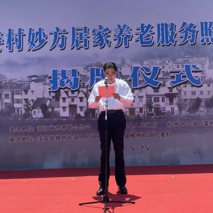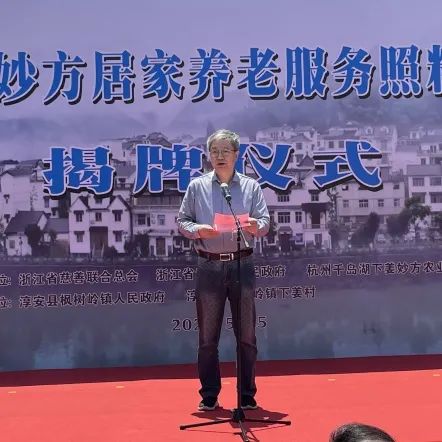 5月25日,“妙方居家养老服务照料中心”揭牌仪式在淳安县枫树岭镇下姜村举行。浙江省政协农业和农村委员会原主任、省粮食和物资储备局原局长、省慈善联合总会副会长姚少平,浙江省民政厅二级巡视员、省慈善联合总会副会长兼秘书长蔡国华,浙江省工商联原副巡视员、省慈善联合总会特聘专员吴永平,淳安县人民政府副县长金晨旦,淳安县民政局党委委员朱国新,杭州下姜妙方农业科技有限公司负责人施妙方,下姜村党总支书记姜丽娟等领导和有关人员出席仪式。淳安县枫树岭镇党委书记余慧梅主持仪式。