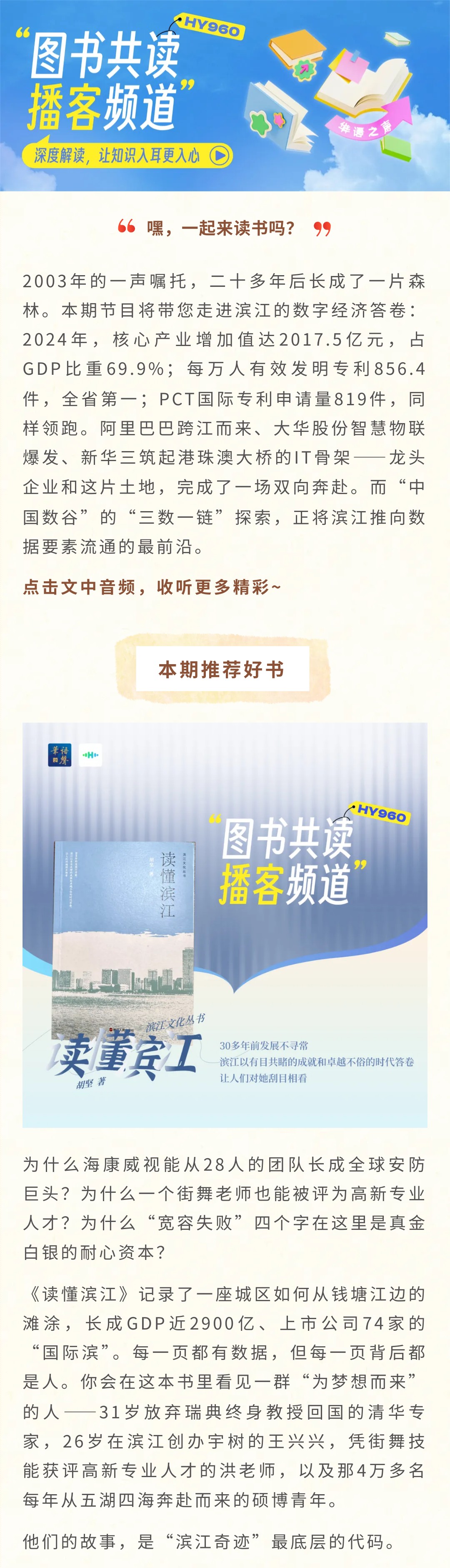 图书共读播客频道丨读懂滨江一滴水与钱塘江的时代隐喻:讲述书中描绘的生动意象——钱塘江源头的一滴滴水珠,经过蜿蜒曲折的山谷,最终汇聚成钱塘江口滔天的浪潮。微小汇聚伟大,平凡造就辉煌,这正是无数个在滨江奋斗的年轻人,汇聚起实现新蓝图的万千憧憬的生动写照。 未来的产业与创新:重点解读滨江如何建设全球数字经济创新中心。紧盯“中国视谷”“国际零磁科学谷”“中国数谷”产业布局,加快形成新质生产力。坚持“人才带技术、技术变项目、项目融资金、实现产业化”的路径,秉持“不拘一格降人才”和“宽容失败”的理念,全面提升发展原动力。 未来的社会与生活:讲述滨江建设智慧城市标杆的决心,推动5G、物联网在城市管理中的应用,实现“一网通办”和“最多跑一次”。完善教育、医疗、养老等公共服务,建设宜居宜业宜游的现代化城区,增强居民幸福感。 未来的生态与营商环境:描绘绿色低碳的示范区愿景,推动碳达峰、碳中和目标落地;优化营商环境,强化增值服务效能,构建“引得进、迁不走”的产业生态。 未来的国际化形象:建设开放包容的国际化城区,增强全球资源配置能力,吸引国际高端人才、企业和资本,为全球城市发展提供“滨江样板”。