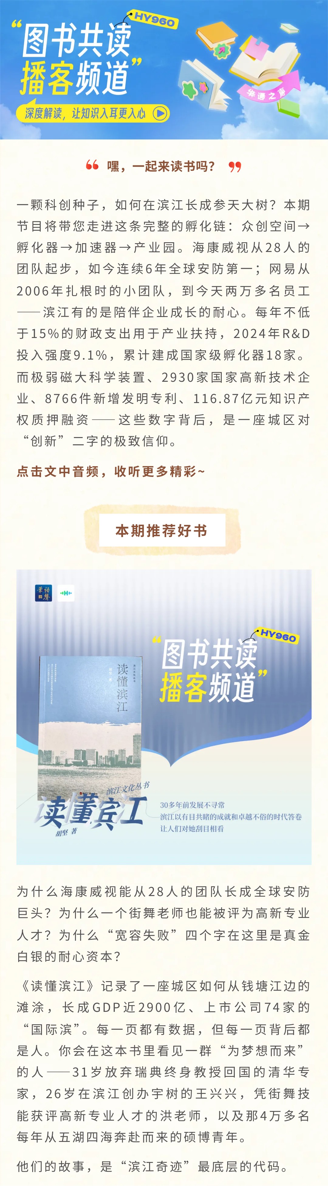 图书共读播客频道丨读懂滨江一滴水与钱塘江的时代隐喻:讲述书中描绘的生动意象——钱塘江源头的一滴滴水珠,经过蜿蜒曲折的山谷,最终汇聚成钱塘江口滔天的浪潮。微小汇聚伟大,平凡造就辉煌,这正是无数个在滨江奋斗的年轻人,汇聚起实现新蓝图的万千憧憬的生动写照。 未来的产业与创新:重点解读滨江如何建设全球数字经济创新中心。紧盯“中国视谷”“国际零磁科学谷”“中国数谷”产业布局,加快形成新质生产力。坚持“人才带技术、技术变项目、项目融资金、实现产业化”的路径,秉持“不拘一格降人才”和“宽容失败”的理念,全面提升发展原动力。 未来的社会与生活:讲述滨江建设智慧城市标杆的决心,推动5G、物联网在城市管理中的应用,实现“一网通办”和“最多跑一次”。完善教育、医疗、养老等公共服务,建设宜居宜业宜游的现代化城区,增强居民幸福感。 未来的生态与营商环境:描绘绿色低碳的示范区愿景,推动碳达峰、碳中和目标落地;优化营商环境,强化增值服务效能,构建“引得进、迁不走”的产业生态。 未来的国际化形象:建设开放包容的国际化城区,增强全球资源配置能力,吸引国际高端人才、企业和资本,为全球城市发展提供“滨江样板”。 -