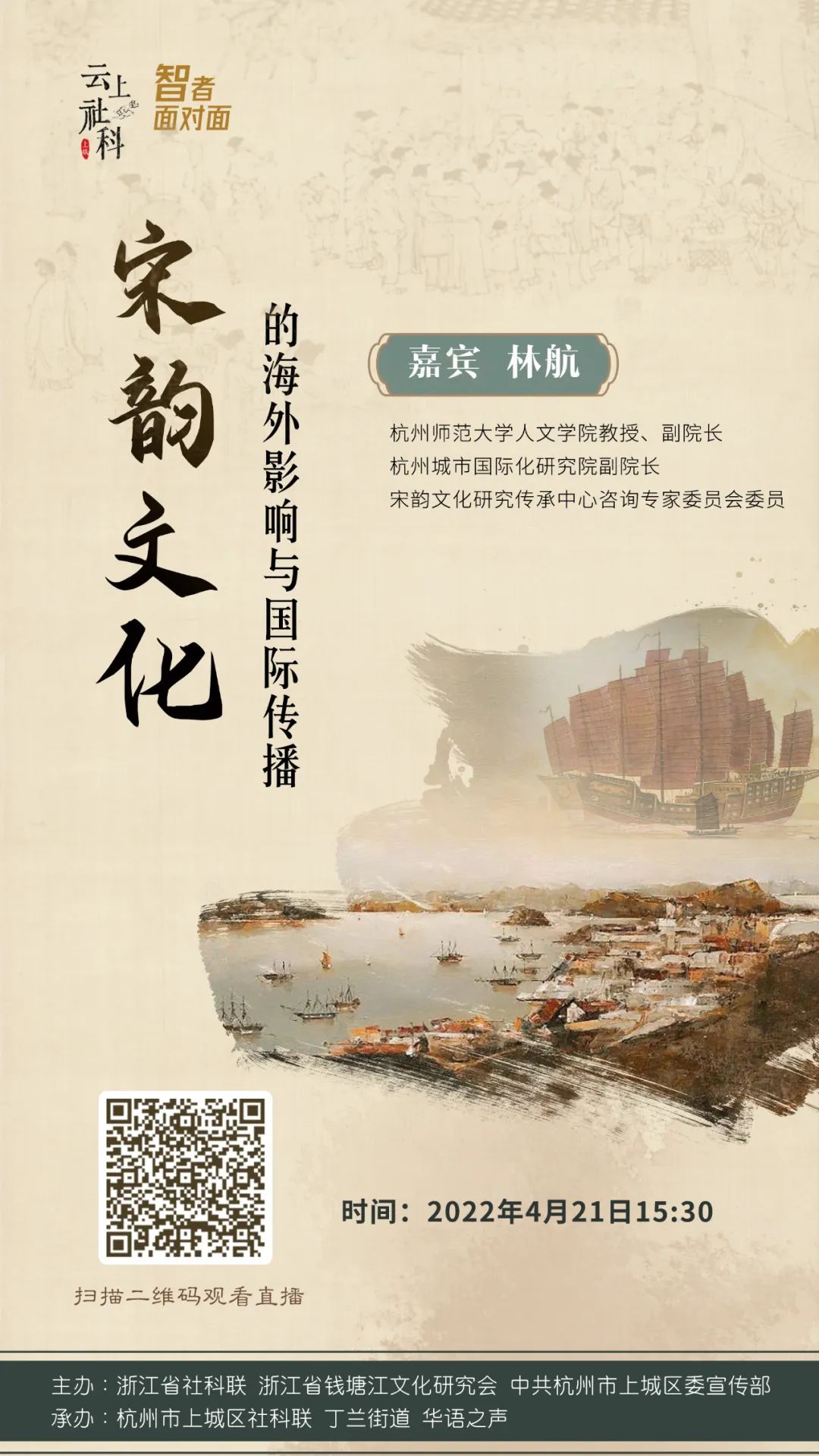 在节目中,林航老师将围绕以下主题,从海内外学者对宋韵文化的不同认知,带领我们跳出杭州、浙江,甚至跳出两宋统治地域,解码宋韵文化。